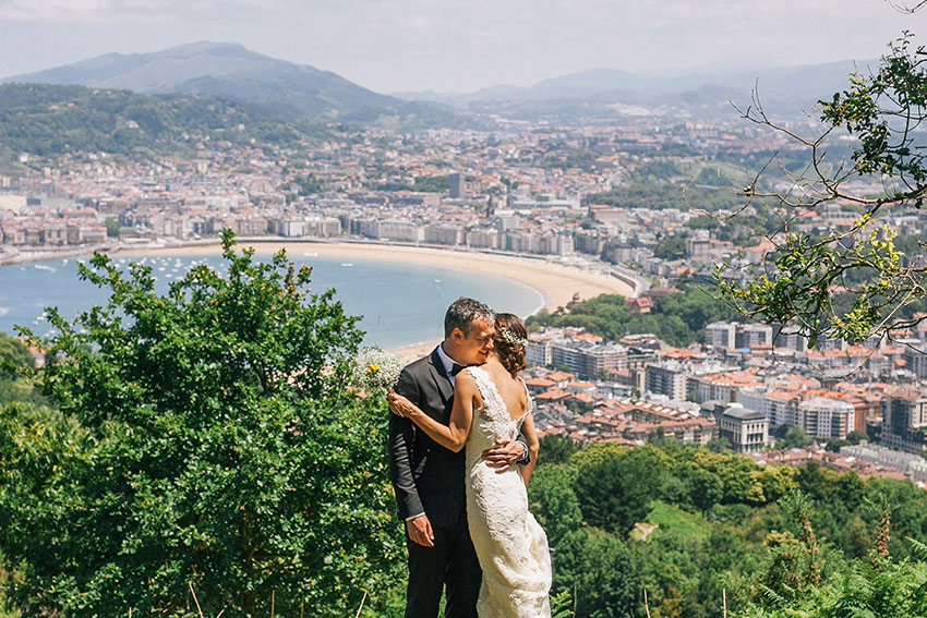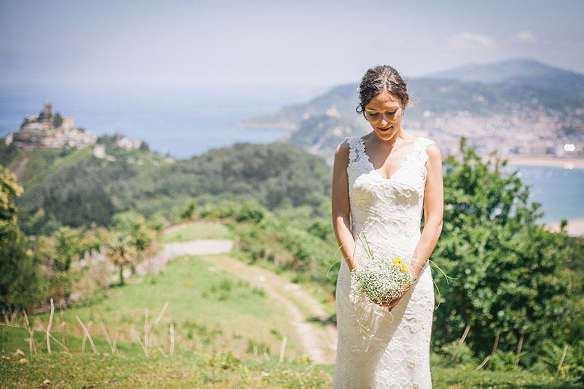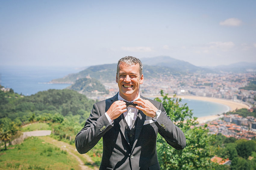 Aquí tenéis el reportaje de Aitor y Ainara. Una boda elegante y espectacular en Donosti. Soy muy fan de este tipo de enlaces, con muchos detalles, al aire libre y muy personales. Una ceremonia civil en el hotel Gudamendi, marcada por un rito celta que sustituyo a las alianzas por un pañuelo escocés que se anudaron los novios. El padre de la novia también le cantó a la novia junto al coro Lezkarri de Igeldo, entre otras canciones la preferida de la novia, «El rey león». Tras ello, el cocktail al aire libre con todos los montes y sierras de Gipuzkoa a sus pies. También tuvieron música en directo a cargo del grupo Latitud 43. Aitor se animó y le cantó una canción en directo a la novia.